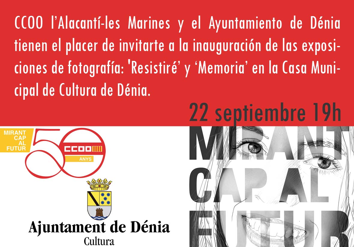 La Casa de Cultura de Dénia acogía este jueves la inauguración de las exposiciones “Resistiré” y “Memoria” organizadas por CCOO l’Alacantí-les Marines con el apoyo del Excmo. Ayuntamiento de Dénia, y que contó con la asistencia de Paco Molina, secretario general de CCOO PV y Rafael Carrió, primer teniente de alcalde y concejal de Cultura del Ayuntamiento de Denia.